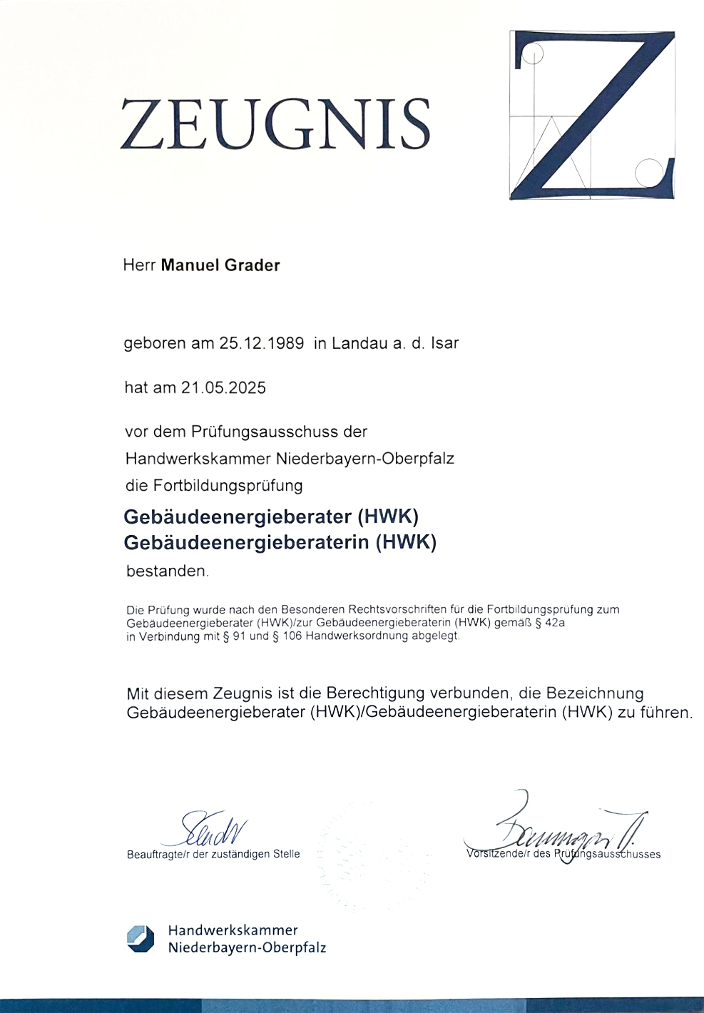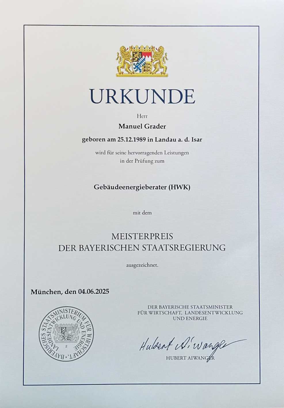 Unser Juniorchef Manuel Grader hat die Fortbildung zum Gebäudeenergieberater (HWK) erfolgreich abgeschlossen – und wurde dafür mit dem Meisterpreis der Bayerischen Staatsregierung ausgezeichnet.